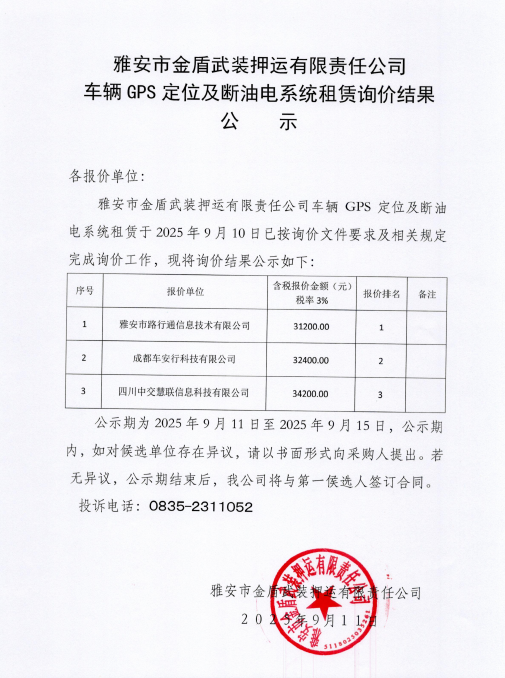 雅安市金盾武装押运有限责任公司车辆GPS定位及断油电系统租赁询价结果公示