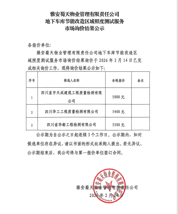 雅安蜀天物业管理有限责任公司地下车库节能改造区域照度测试服务市场询价结果公示